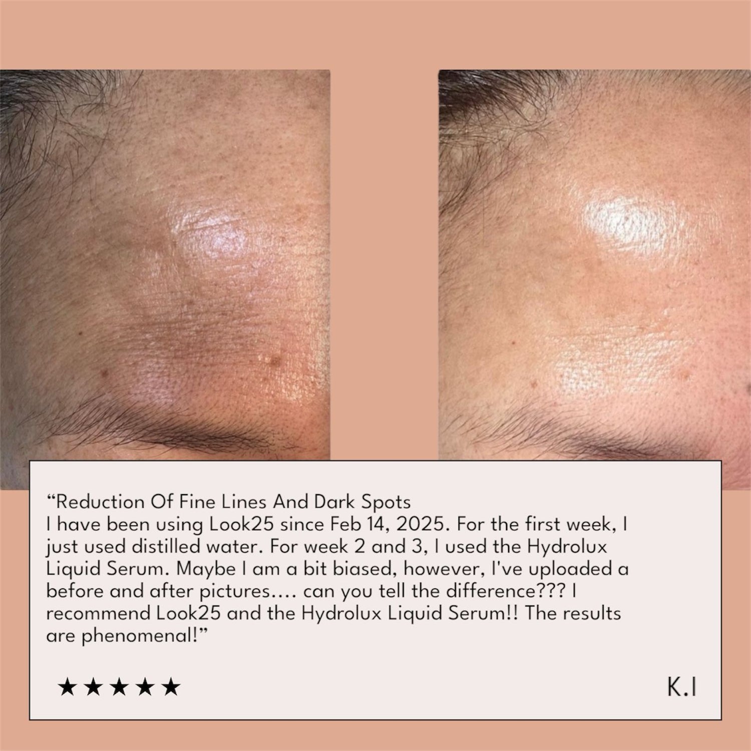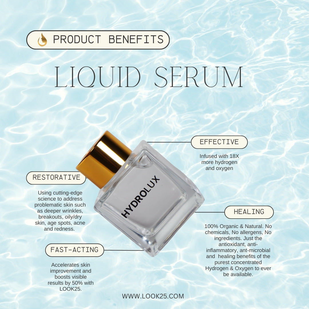 LOOK25, our patented HydroLux Liquid delivers 18X the concentration of Hydrogen & Oxygen for an unparalleled skin transformation.